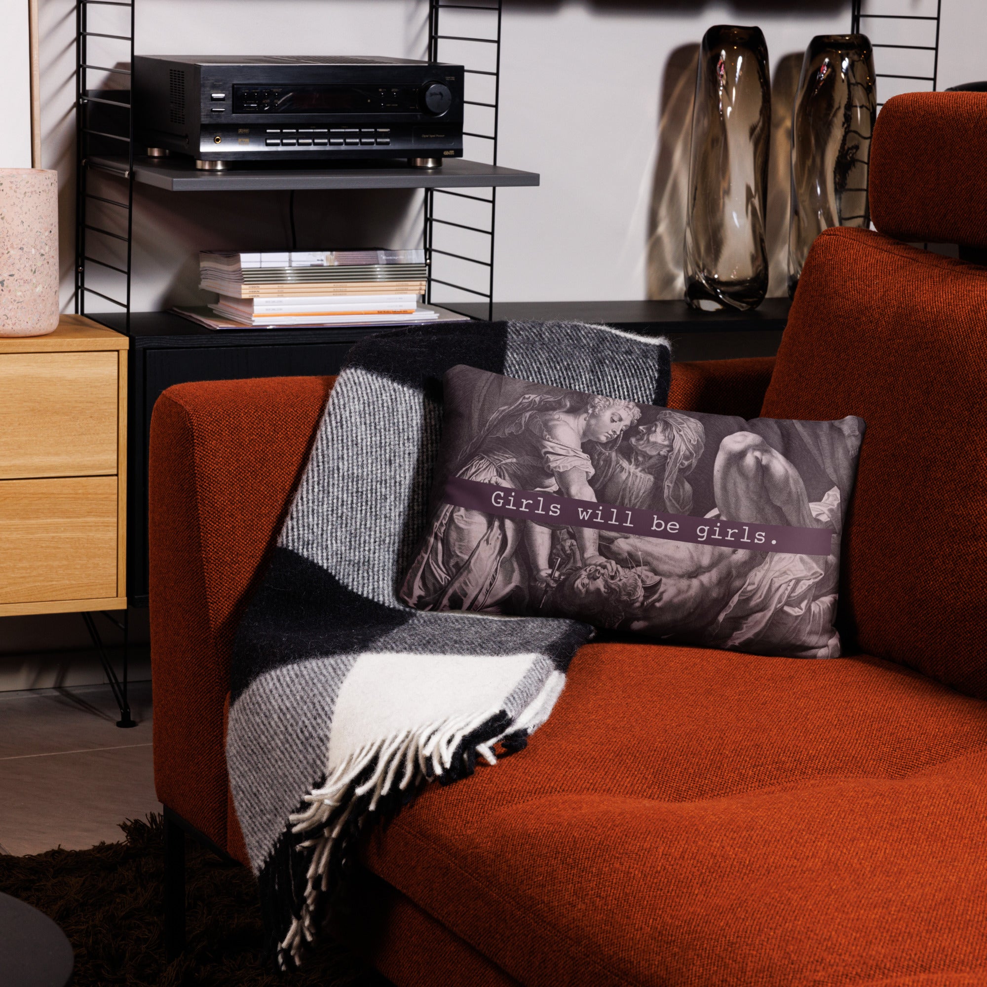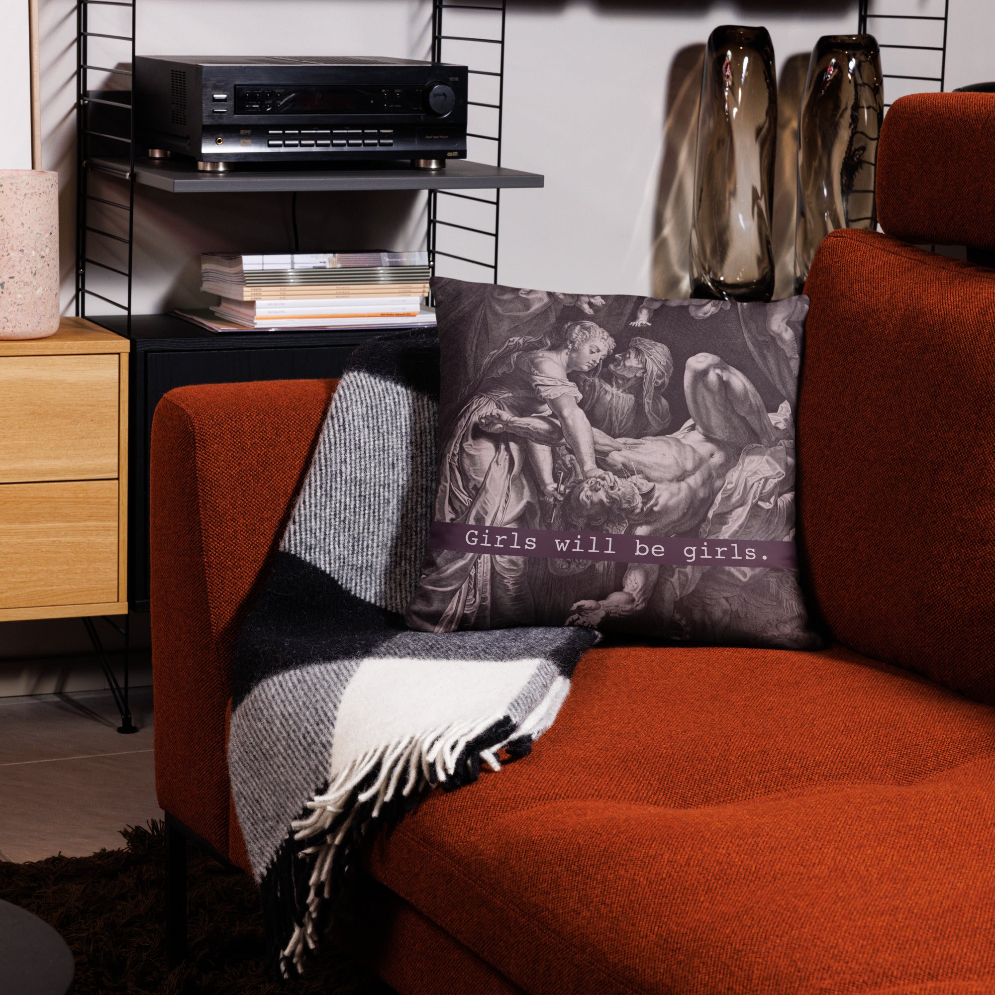 Unleash your snarky side with our Basic Pillow! Featuring the iconic Judith Slaying Holofernes painting and the phrase "Girls will be girls," this throw pillow is the perfect nod to feminism, dark humor, and classical art. Make a statement in style. Take that, patriarchy!